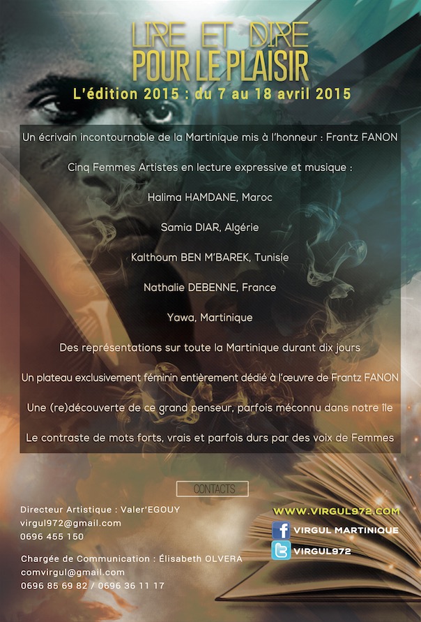 – mercredi 15 avril : 19h30 : Bibliothèque Schoelcher de Fort-de-France, entrée libre