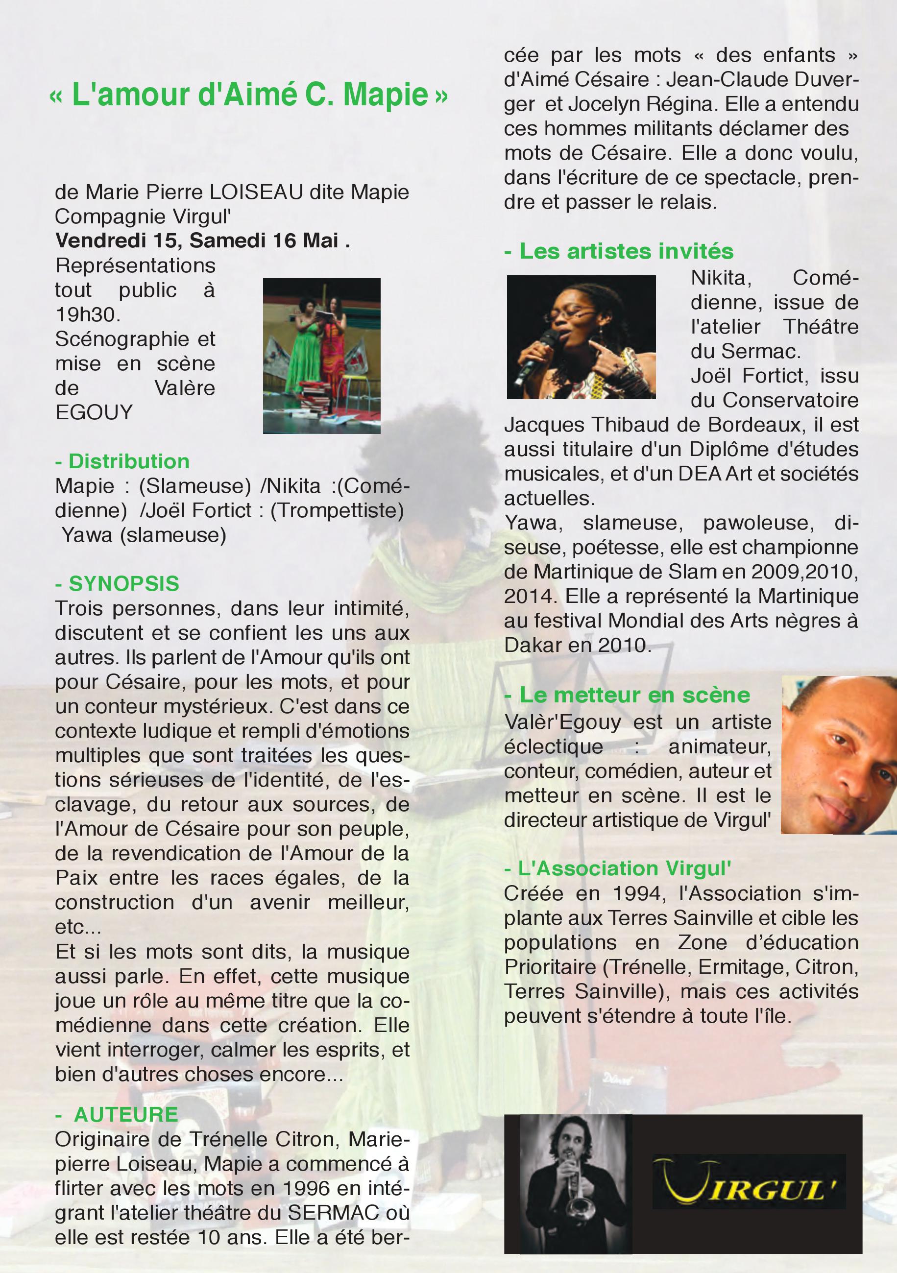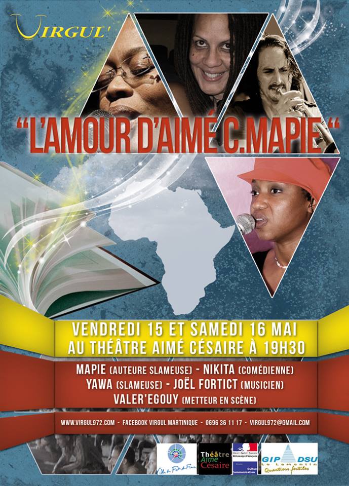 L’Amour d’Aimé C. Mapie » ven 15 et sam 16 mai 2015 10 mai 2015 adm Événements, Rendez-vous du mois « L’Amour d’Aimé C. Mapie » avec Mapie (Slameuse), Nikita (comédienne) et Joël (trompette plus surprise) vendredi 15 et samedi 16 mai 2015 au Théâtre Aimé CESAIRE à Fort-de-France… Un voyage d’une heure mise en scène par Valer’EGOUY Share This Tweet Partager Partager Email adm Articles connexes Mardi 26 janvier – Lectures Expressives d’extraits de textes de Jala Ce mardi 26 janvier 2021, AMI se joint à LAM (Les Auteurs.es de Martinique) et… 14ème Festival International Contes et Musique dans la Cité Rendes-vous du 13 au 25 octobre 2020. Contes à la Pleine Lune jeudi 1er oct 2020