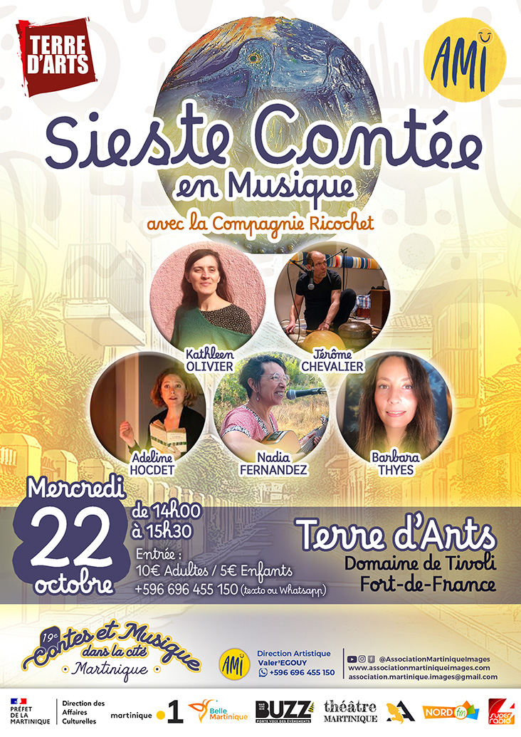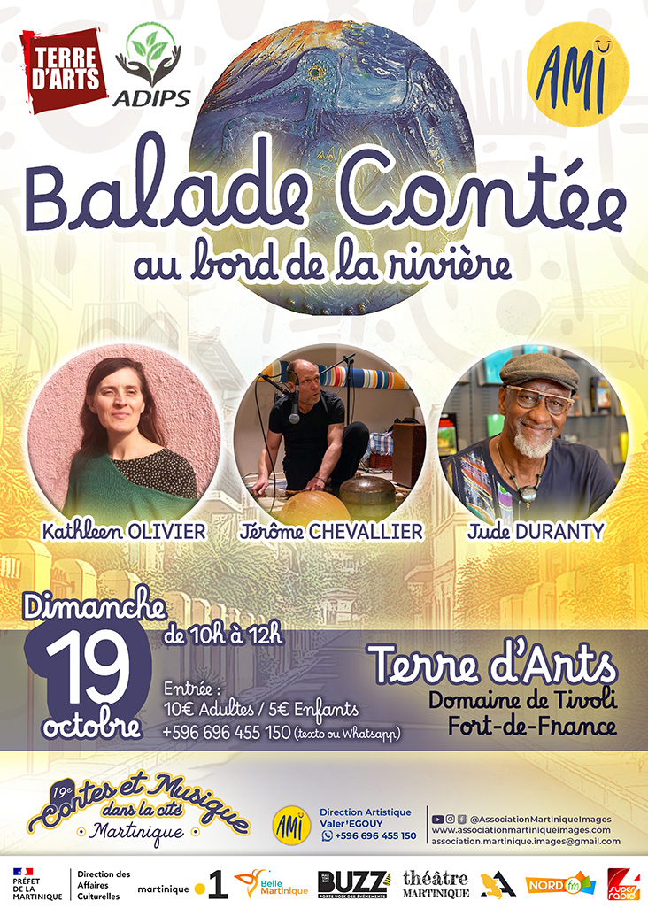 Fort-de-France : Patio 19 et Terre d’Arts sur le Domaine de Tivoli – nous vivrons ensemble des « Temps de Contes » en présence de tous les artistes du festival. Inscription ou réservation par écrit (prénom et nom) via WhatsApp. Bienvenue !