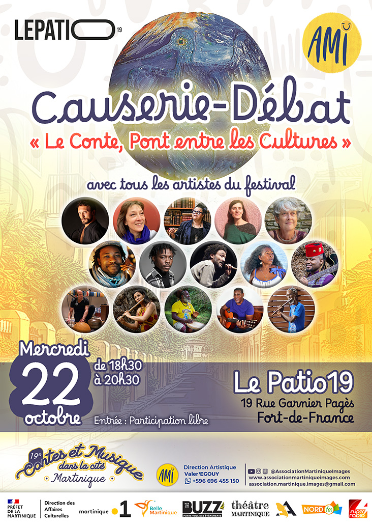 Il y aura une « Causerie-Débat » invitant les artistes d’ici et d’ailleurs à bokanté 1 leurs Paroles sur le thème « La tradition Orale d’hier à aujourd’hui » ou « Le Conte, Pont entre les Cultures ». Ouvert à tous mercredi 22 octobre à 18h30 au Patio 19 à la rue Garnier Pagès au centre-ville à Fort-de-France, vous viendrez enrichir la discussion ou écouter activement !