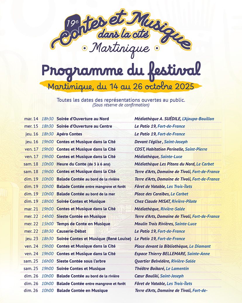 L’AMI vous fait avec plaisir, une invitation aux voyages dans les imaginaires, les sens, la Mémoire universelle. Venez suivre notre programmation variée de Contes et Musique, écouter le chant des langues natales de ces artistes prêts à vous dire leur authenticité au 19e Festival International « Contes et Musique dans la Cité », du 14 au 26 octobre 2025 en Martinique.